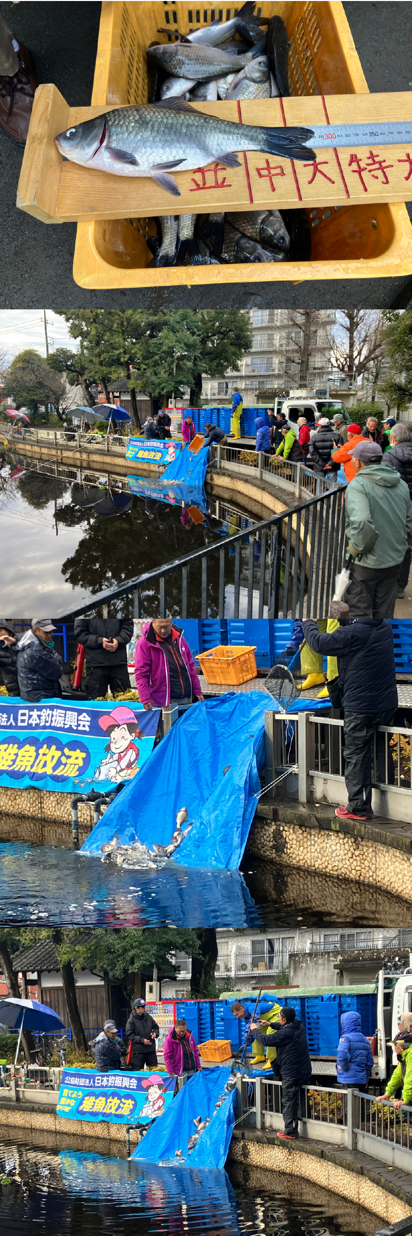 (公財)日本釣振興会東京都支部では、去る12月21日に浮間公園(板橋区)及び清水池公園(目黒区)において、全日本へら鮒放流協議会(全放協)の協力のもと、へらぶな放流を行い、清水池公園には、鵜による食害を少なくする為、30cm弱の大型を中心に放流しました。当日は天候が心配されましたが、雨も本降りになることなく、また気温も12月とは思えない暖かい1日となり、今年も大勢の方が放流の様子を見守っていました。